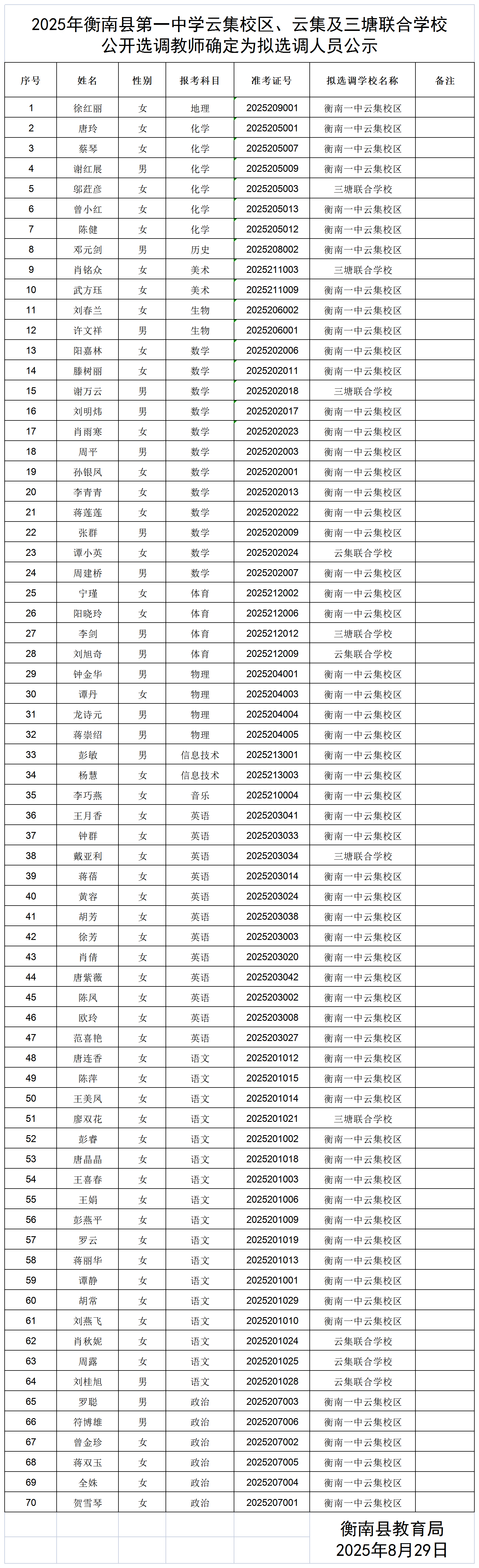 2025年衡南縣第一中學雲集校區、雲集及三塘聯合學校 公開選調教師確定為擬選調人員公示