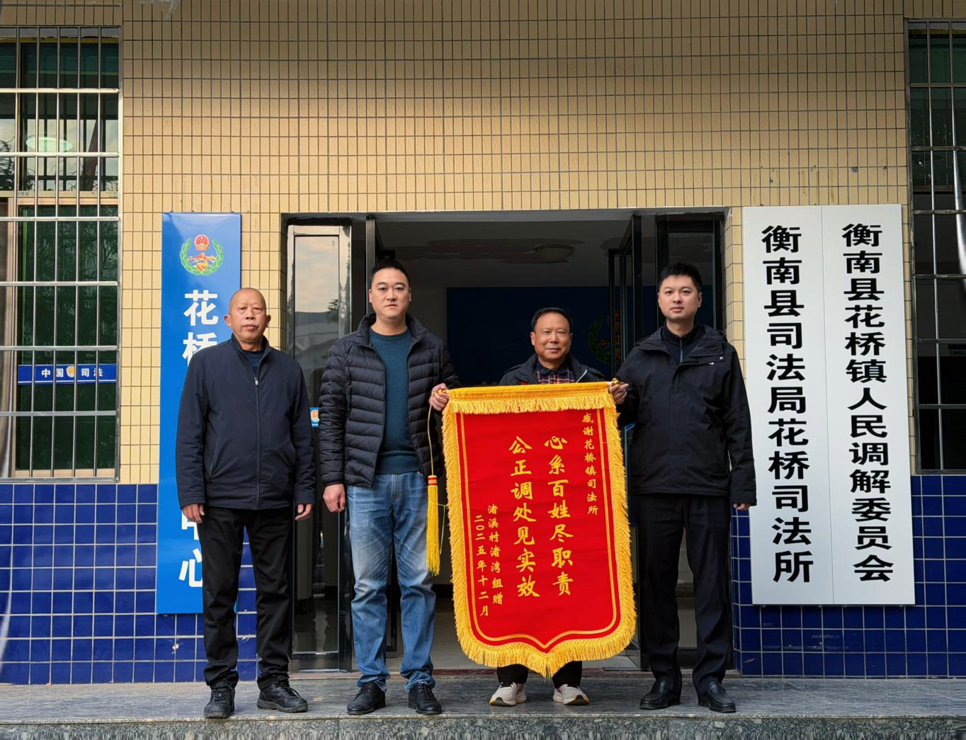 2025年12月30日上午,花橋鎮渚溪村渚灣組組長帶領村民,將一麵寫有"心係百姓盡職責 公正調處見實效"的錦旗鄭重送到衡南縣司法局花橋司法所,樸實的笑臉與鮮豔的錦旗在冬日暖陽下相互映襯,成為基層法治建設最溫暖的注腳。