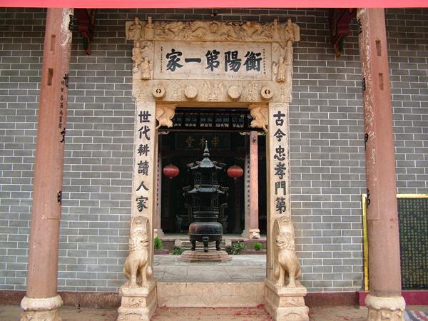 王氏宗祠坐北朝南,磚、石、木混合結構。有48根主柱、柱礎、13條門框等均係石料加工而成。全祠由正堂、左右祠閣五棟聯為一體,石柱木梁,硬山頂,蓋小青瓦;棟間施風火山牆,兩端爪角飛翹,祠高12米。中軸線上由南至北為前後廳,左右為廂房,前置回廊。前廳由正堂、左賢達祠、右節孝祠組成,各三開間,進深一間;前廳正中為戲台,施八角藻井。後廳由崇本堂、左賢達堂、右節孝堂組成,各三開間,進深二間。前後廳之間為天井。左廂房為培槐閣,右廂房為羹梅閣,各六開間,置樓。正門用漢白玉製作,門額陰刻楷書“衡陽第一家”,周施二龍戲珠高浮雕。
