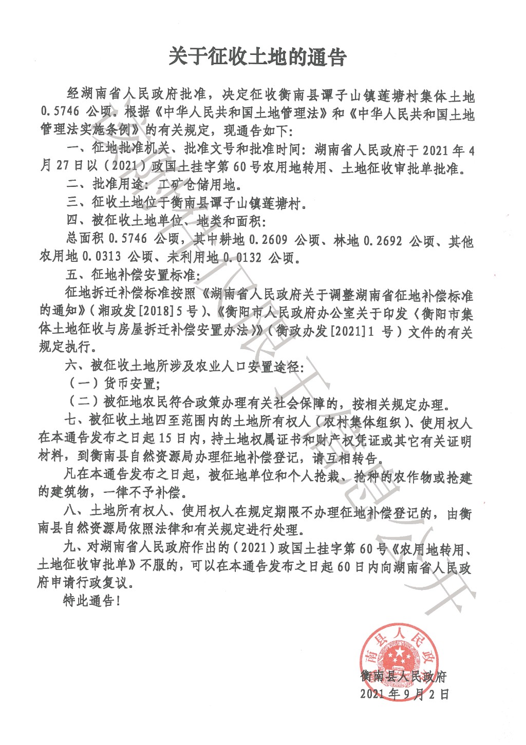 關於征收土地的公告(譚子山鎮蓮塘村)