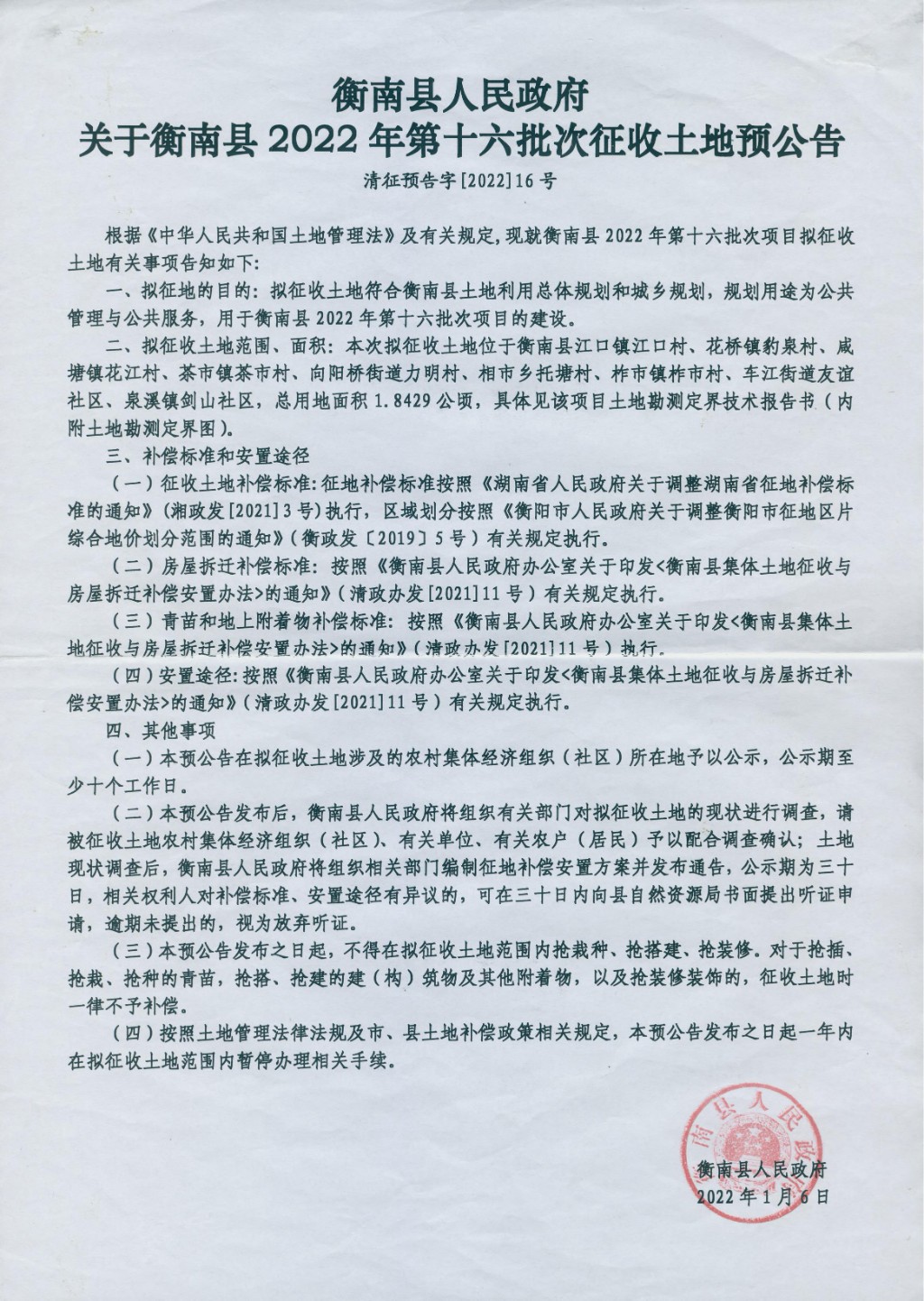 衡南縣人民政府關於衡南縣2022年第十六批次征收土地預公告
