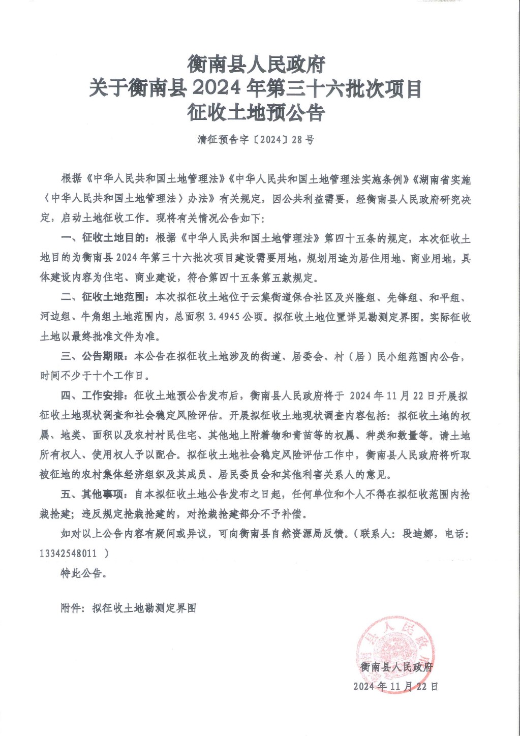 衡南縣人民政府關於衡南縣2024年第三十六批次項目征收土地預公告