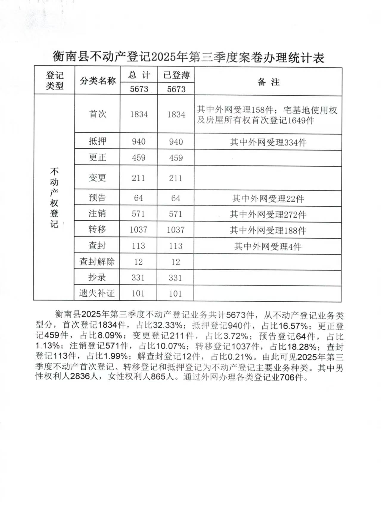 衡南縣不動產登記2025年第三季度案卷辦理統計表