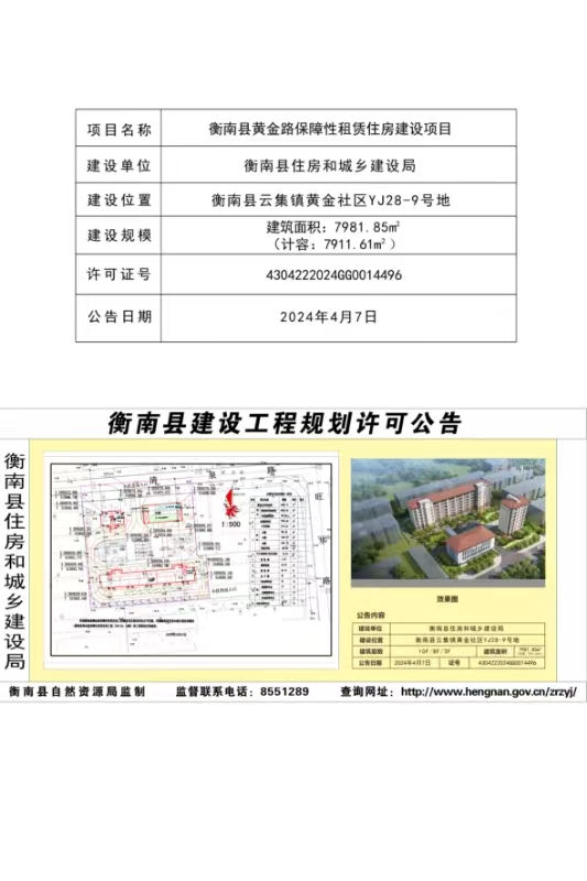 衡南縣建設工程規許可公告(衡南縣黃金路保障性租賃住房建設項目)
