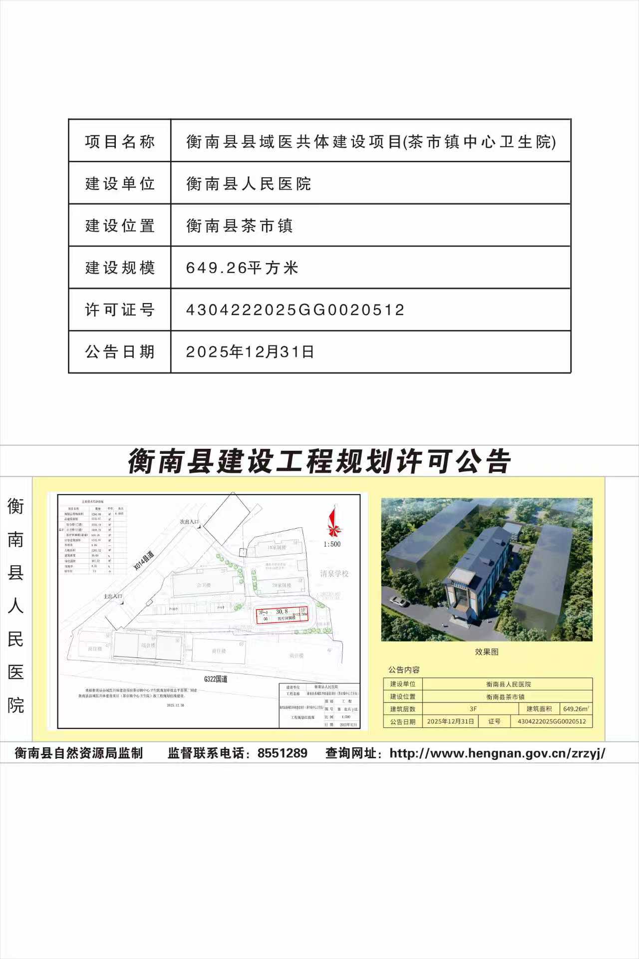 衡南縣建設工程規劃許可公告(衡南縣縣域醫共體建設項目【茶市鎮中心衛生院】)