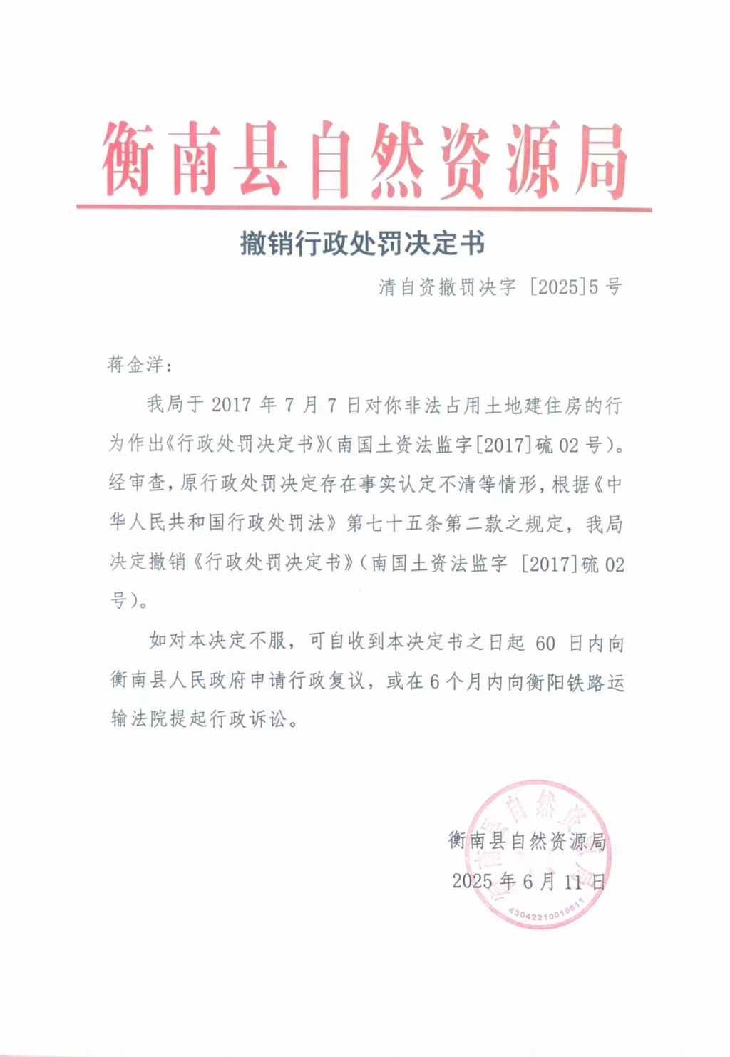 撤銷行政處罰決定書 (清自資撤罰決字【2025】5號)