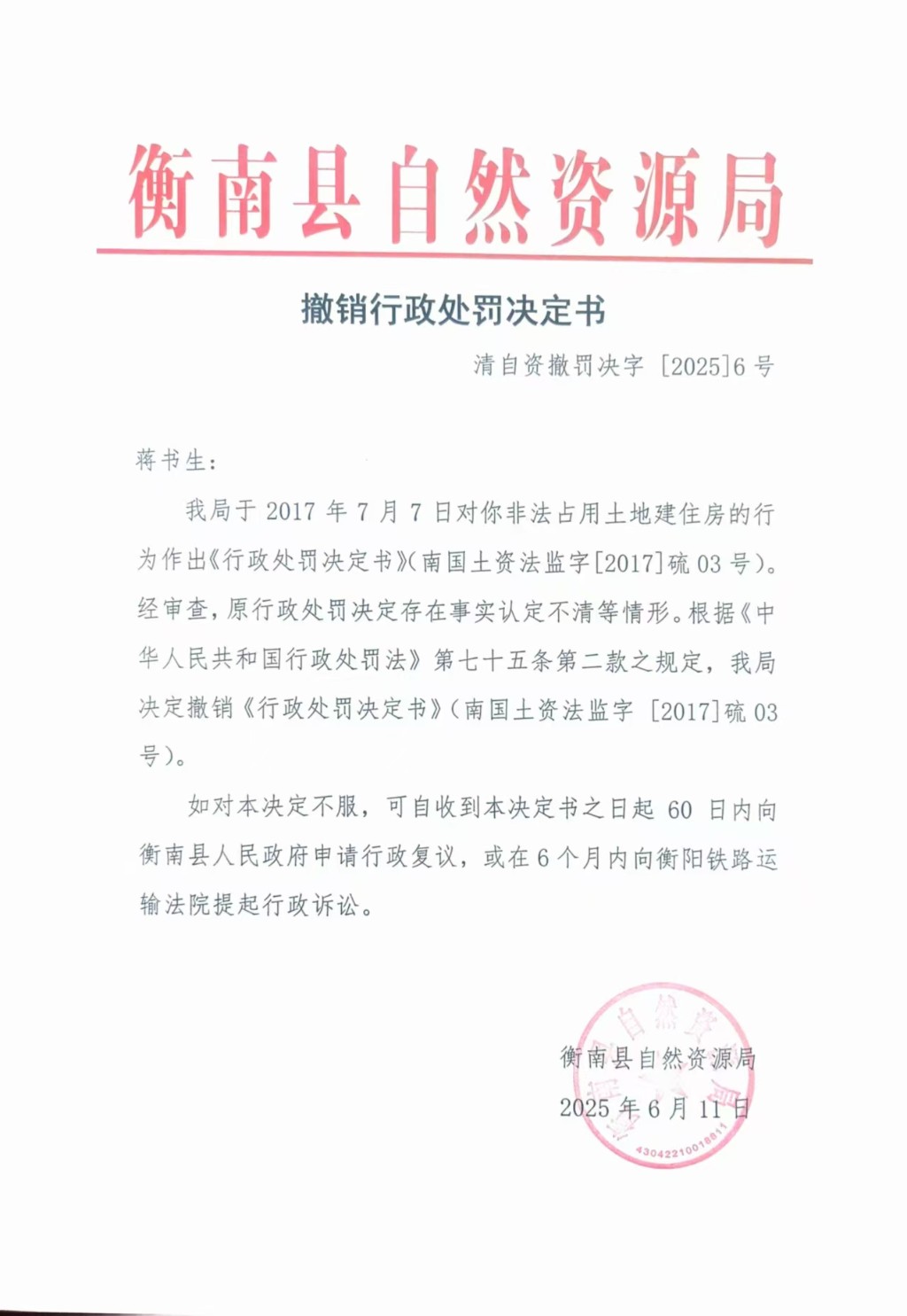 撤銷行政處罰決定書 (清自資撤罰決字【2025】6號)