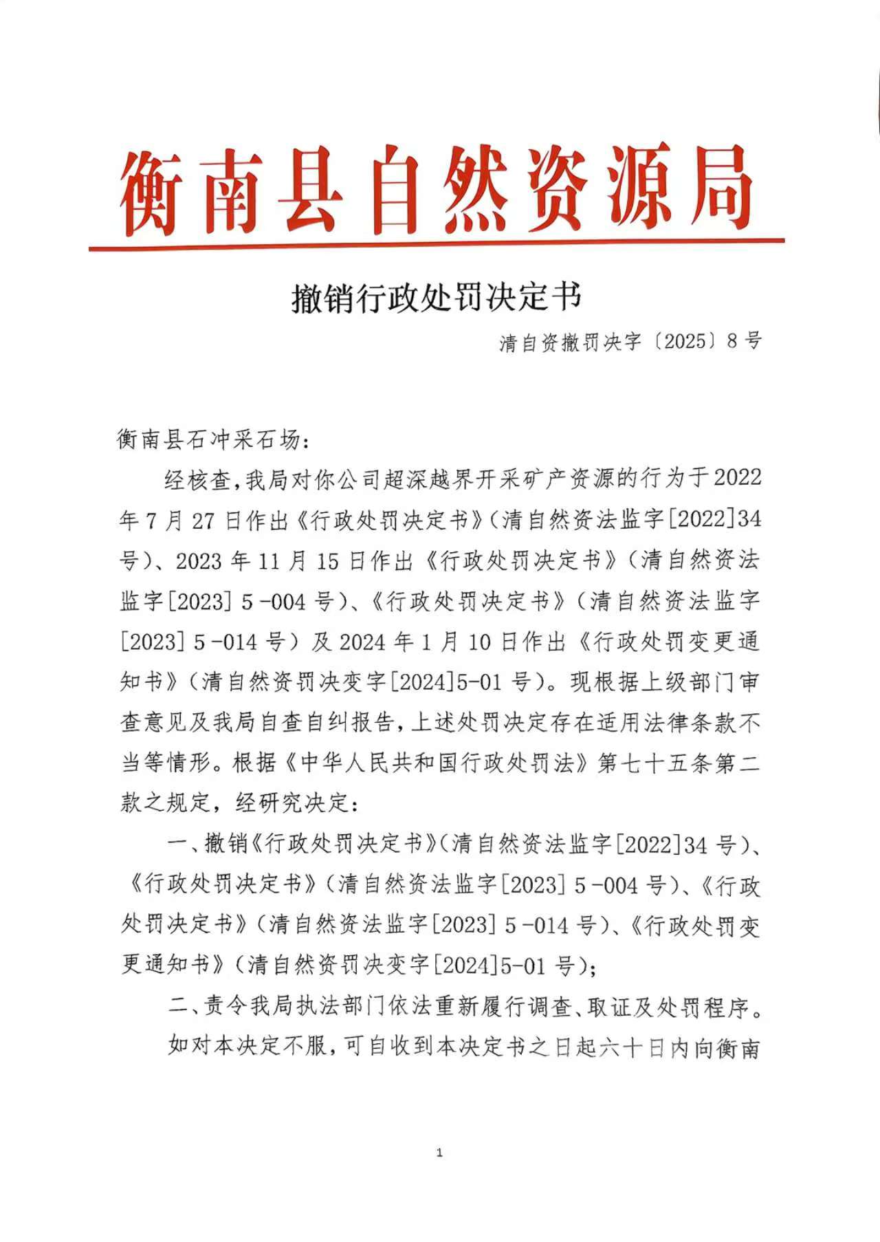 撤銷行政處罰決定書(清自資撤罰決字【2025】8號)