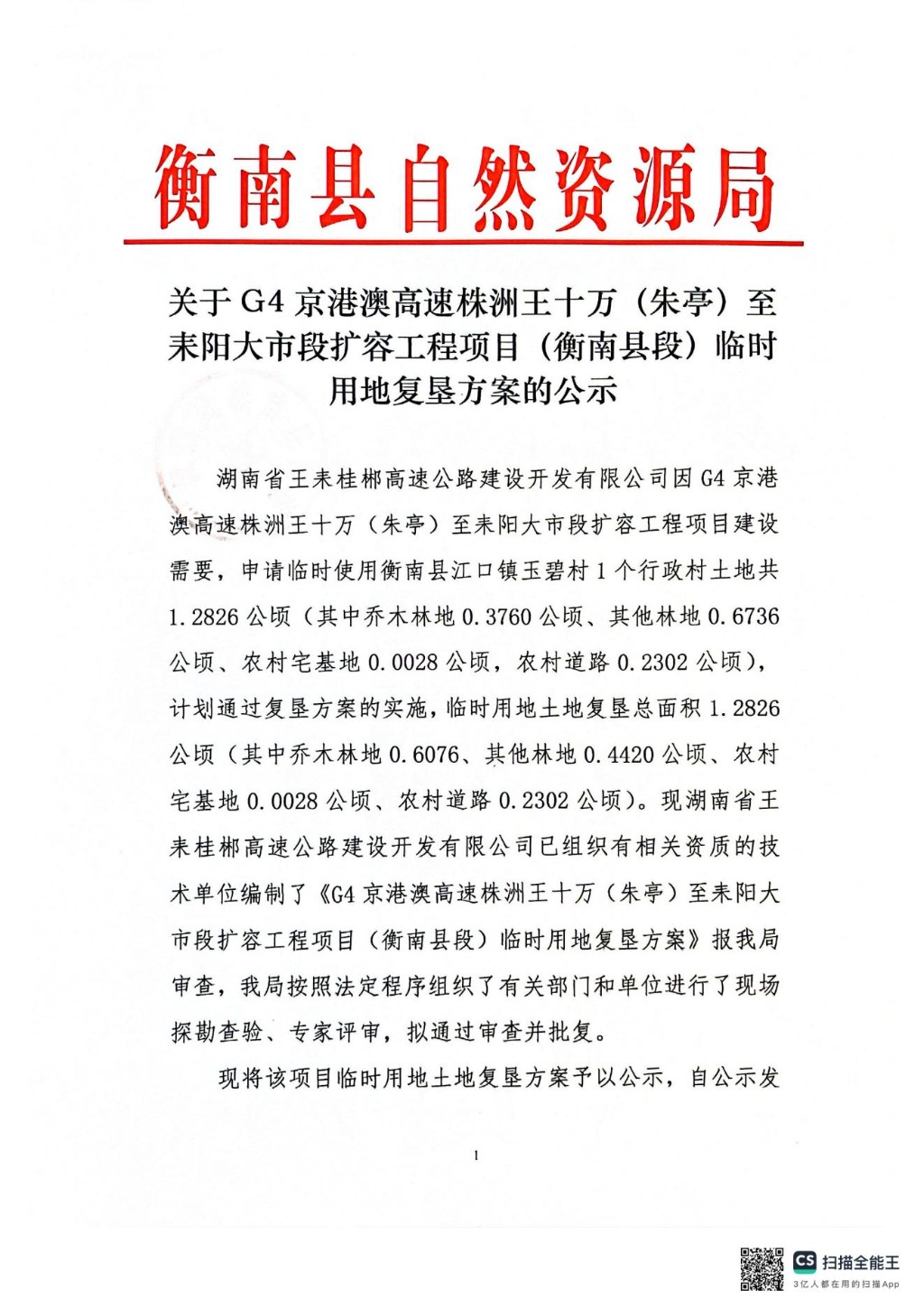 關於G4京港澳高速株洲王十萬(朱亭)至耒陽大市段擴容工程項目(衡南縣段)臨時用地複墾方案的公示