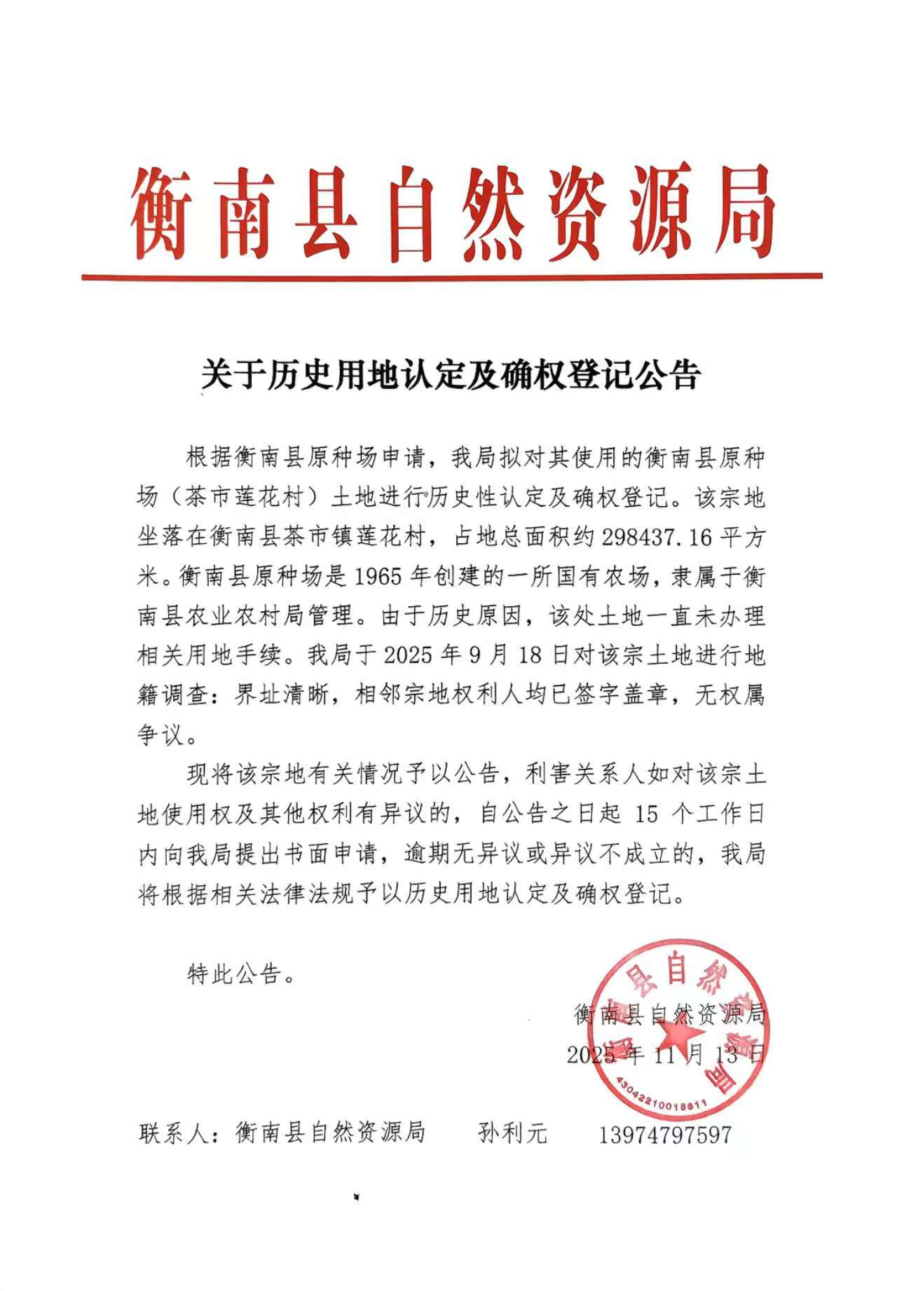關於曆史用地認定及確權登記公告(衡南縣原種場【茶市蓮花村】)