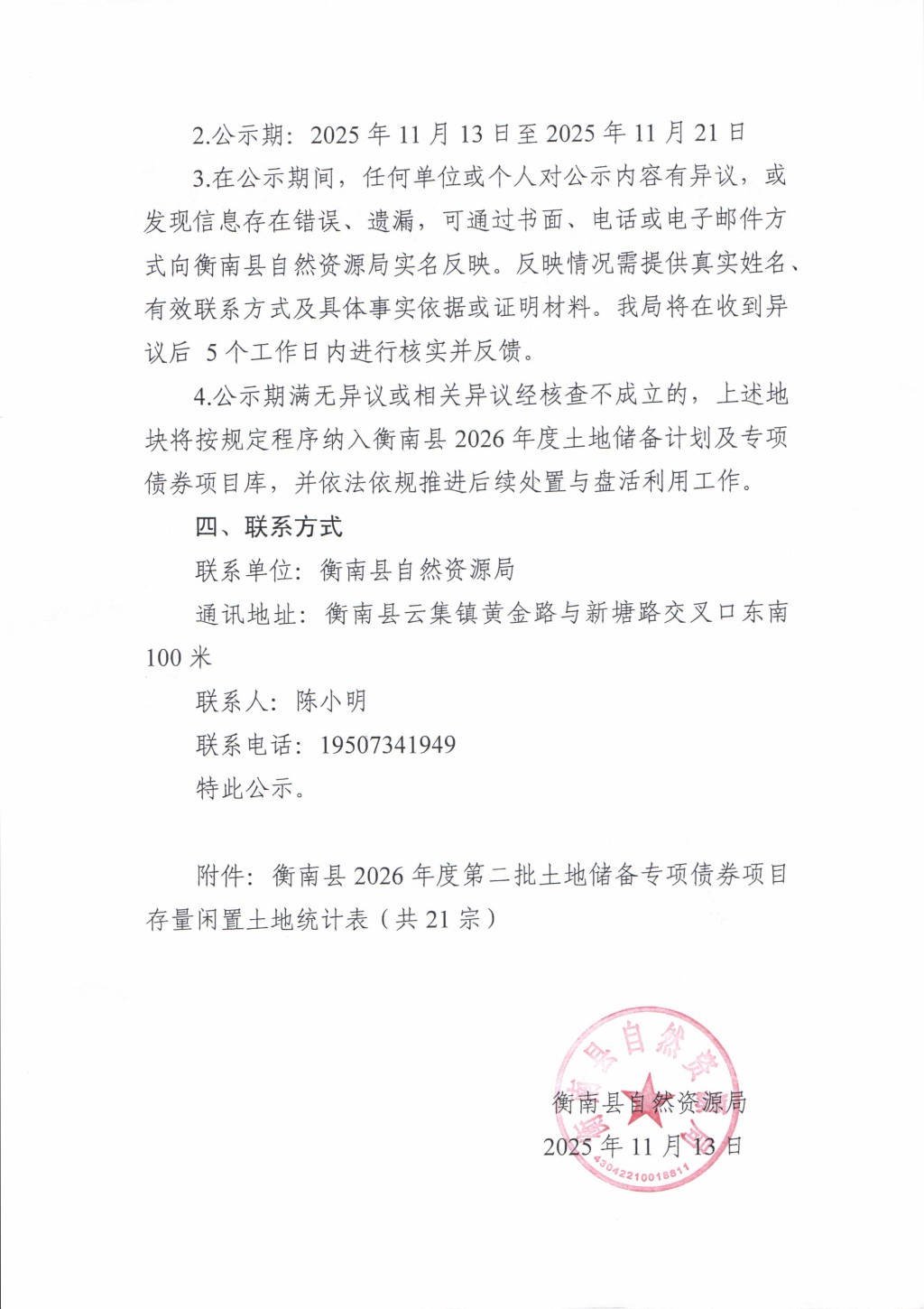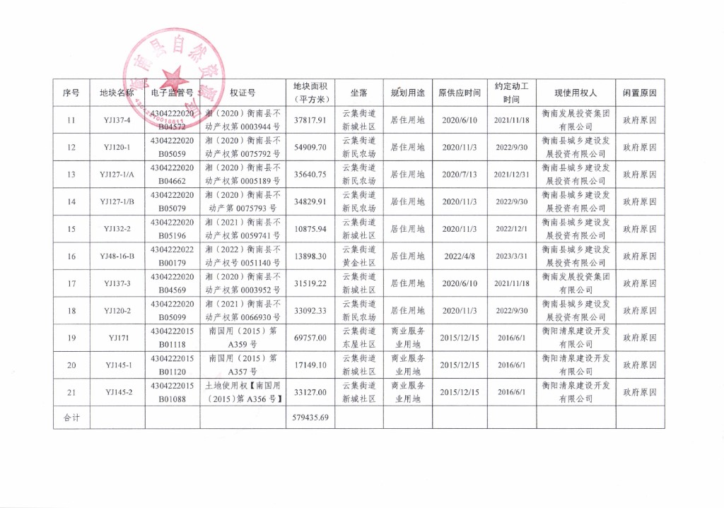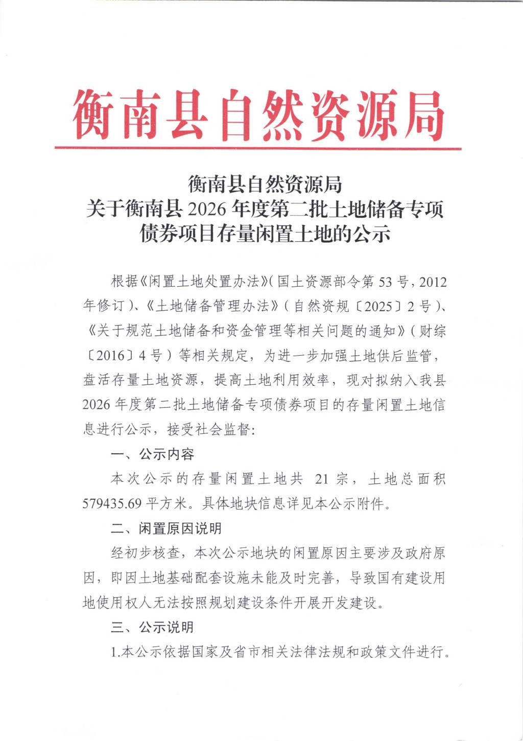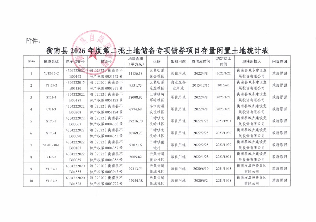 關於衡南縣2026年度第二批土地儲備專項債券項目存量閑置土地的公示