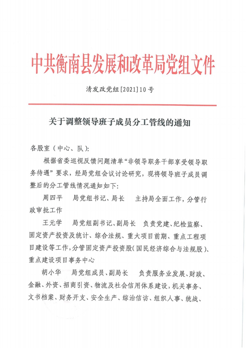 關於調整領導班子成員分工管線的通知