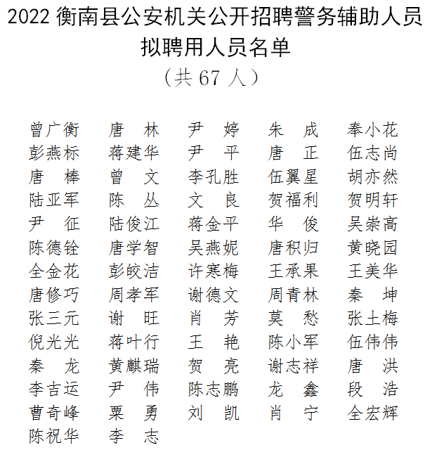根據《衡南縣公安局2022年公開招聘警務輔助人員方案》規定,經發布信息、報名、資格審查、筆試、體能測試、麵試、體檢、考察等程序,現確定曾廣衡等67人為第一批擬聘用人員(詳細人員名單附後),並予以公示,公示期為5個工作日,自2022年7月18日至2022年7月22日。
