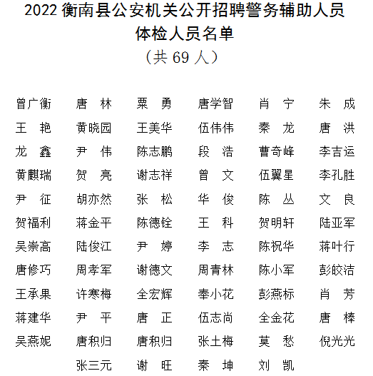 附:2022衡南縣公安機關公開招聘警務輔助人員體檢人員名單