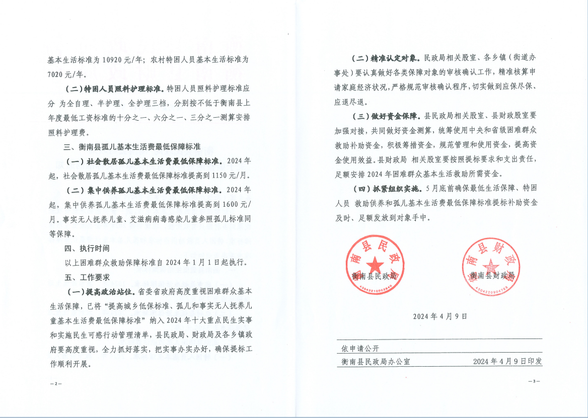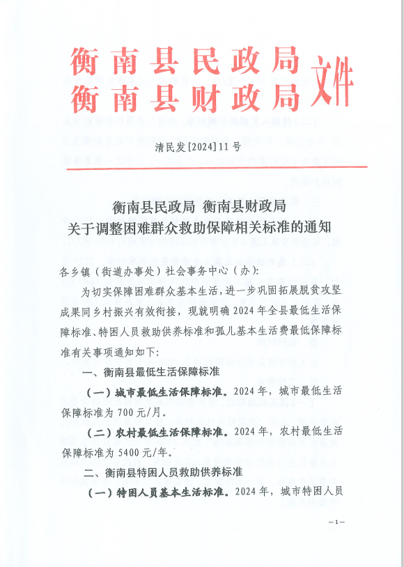 衡南縣民政局 衡南縣財政局關於調整困難群眾救助保障相關標準的通知