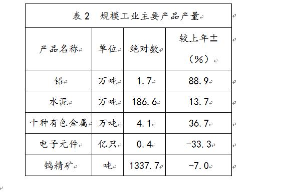 全縣完成規模以上工業總產值179.8億元,規模以上工業實現增加值44.6億元,增長5.4%;實現主營業務收入175億元,實現利潤10.99億元,產品產銷率99.8%。規模工業主要產品產量見表2。