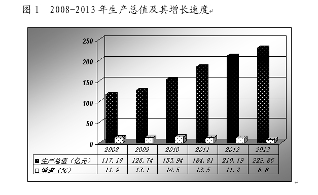 初步核算全年完成生產總值(GDP)229.86億元,增長8.6%。其中第一產業增加值55.62億元,增長2.7%;第二產業增加值114.3億元,增長10.3%,第三產業增加值59.94億元,增長11%。