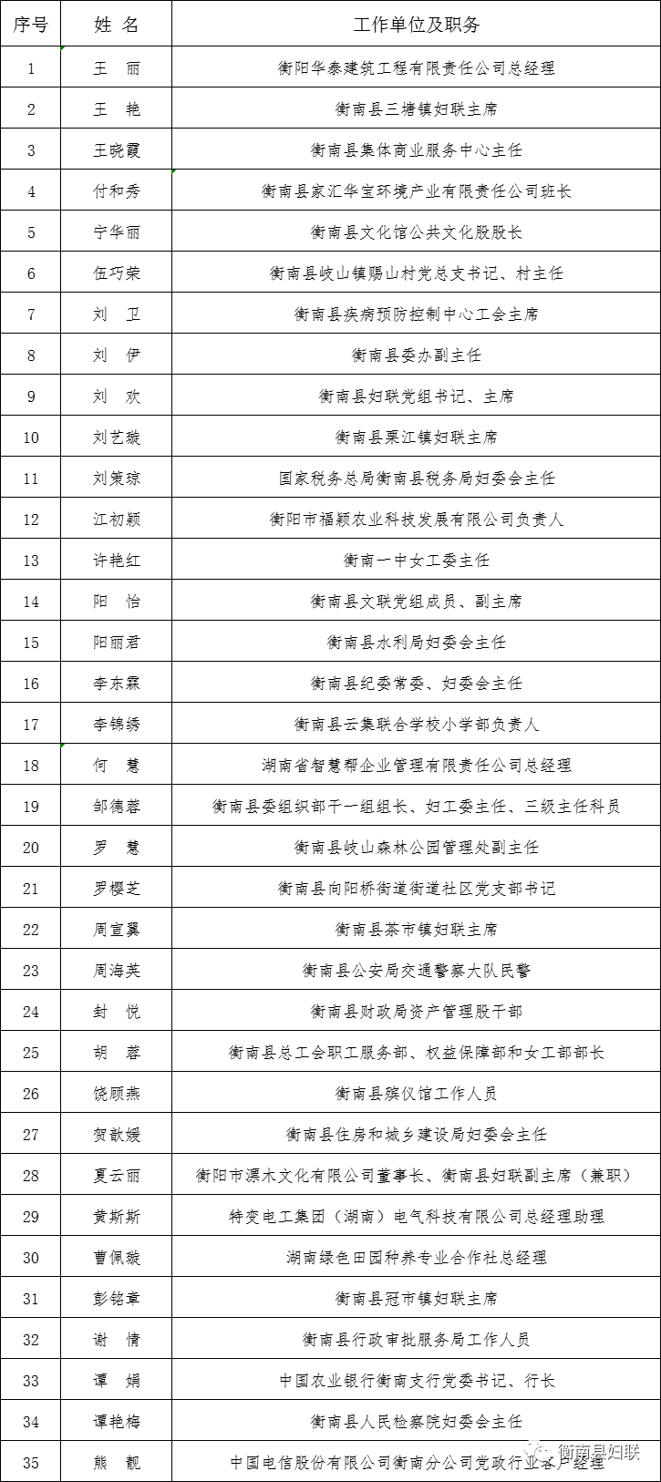 根據《關於推薦衡陽市第十六次婦女代表大會代表人選的通知》(衡婦字〔2023〕17號)文件要求,經過自下而上、上下結合、廣泛征求意見、反複醞釀的基礎上,確定35名衡南縣出席衡陽市第十六次婦女代表大會代表候選人初步人選,現予以公示(名單附後)。