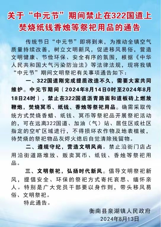 關於“中元節”期間禁止在322國道上焚燒紙錢香燭等祭祀用品的通告