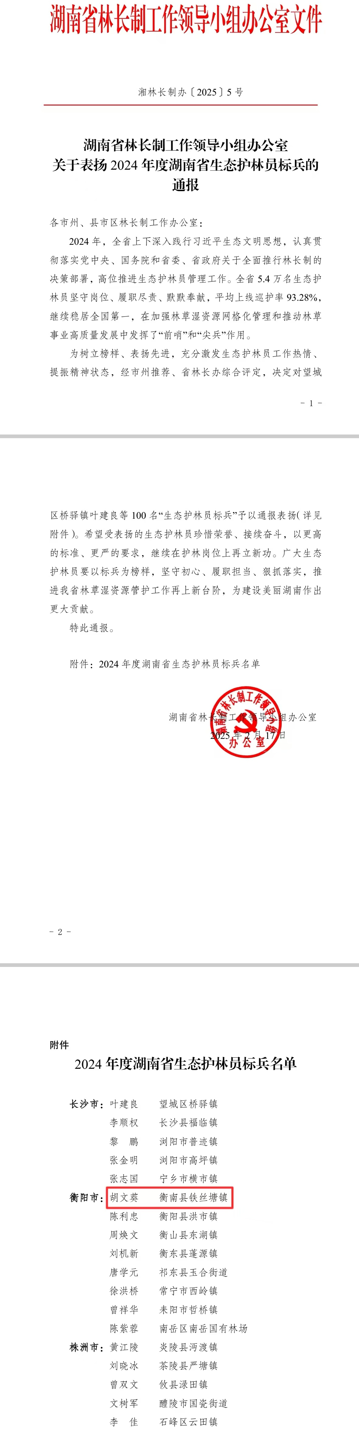 近日,湖南省林長製工作領導小組辦公室發布通報,對2024年度護林成績突出的100 名“生態護林員標兵”予以通報表揚,衡南縣鐵絲塘鎮護林員胡文葵同誌上榜!