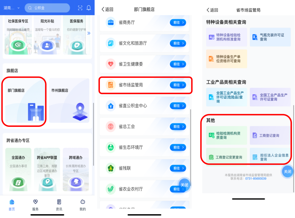 登陸"湘易辦"後,在首頁"部門旗艦店"中選擇"省市場監督管理局",在"其他"欄目中點擊對應服務名稱即可進入;或在首頁直接搜索相應服務名稱進入。