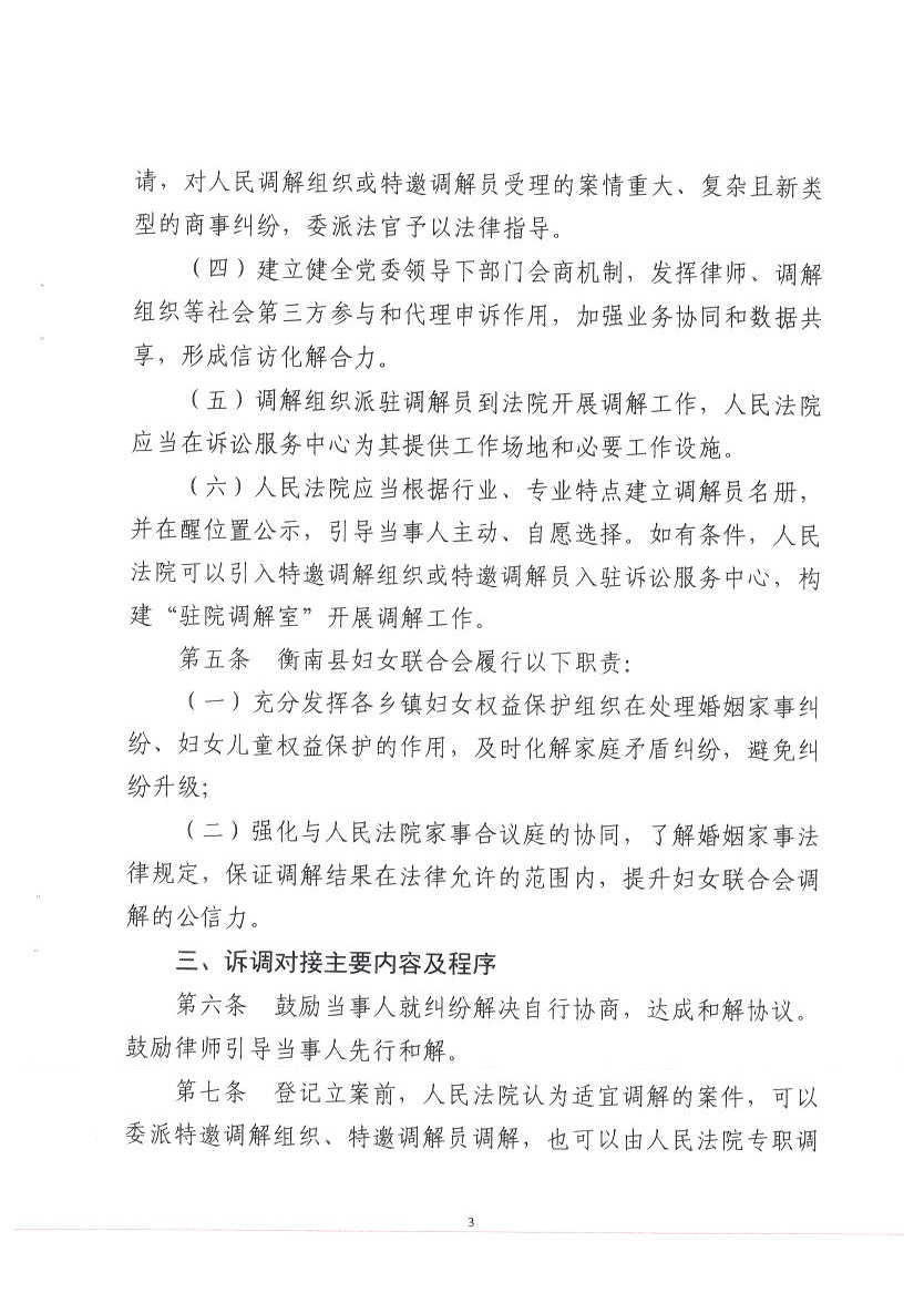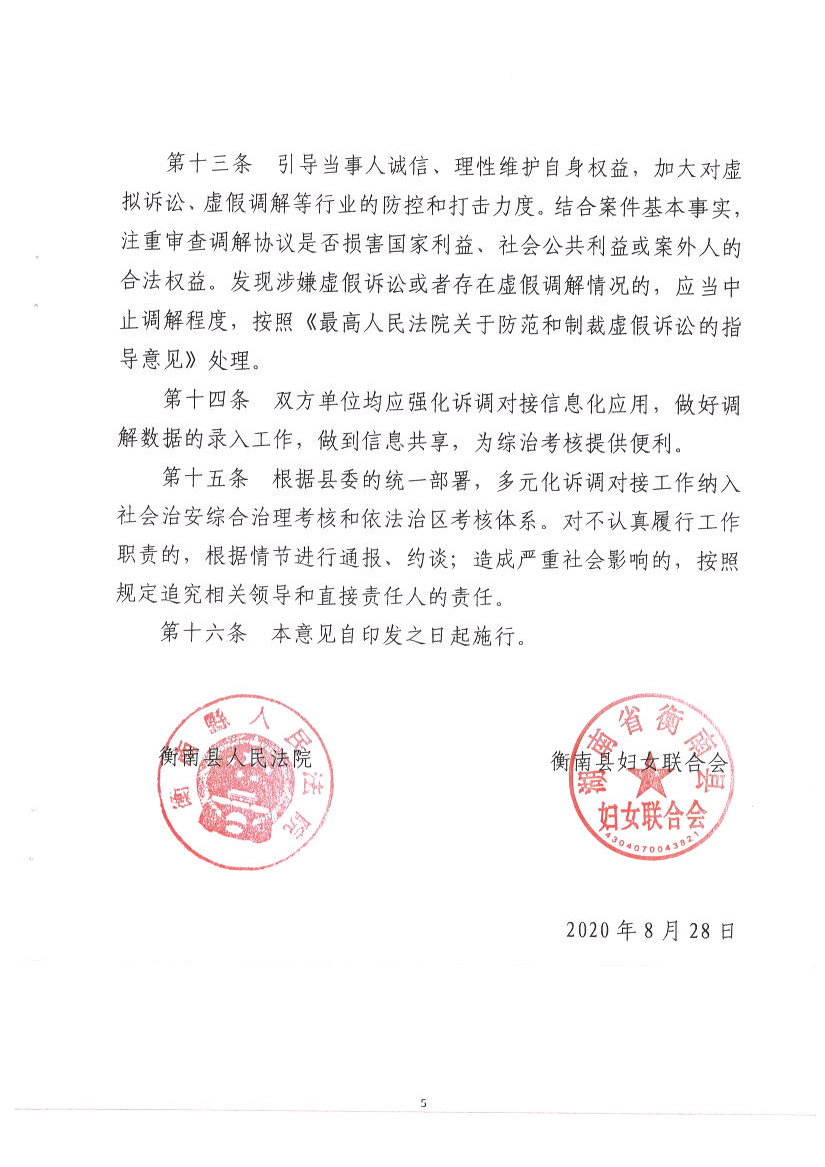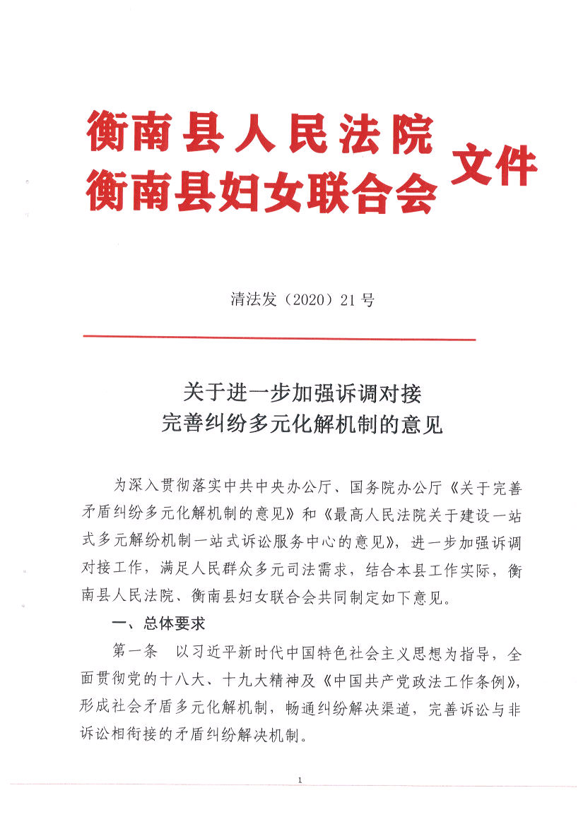 衡南縣人民法院衡南縣婦女聯合會關於進一步加強訴調對接完善糾紛多元化解機製的意見(清法發﹝2020﹞21號)