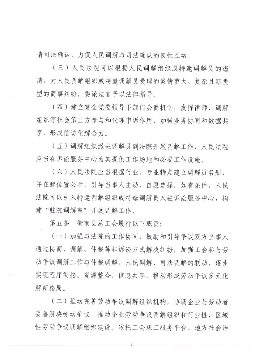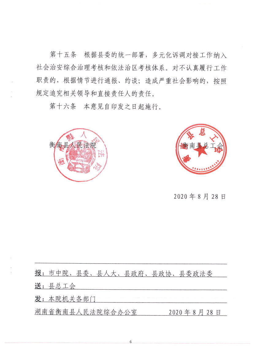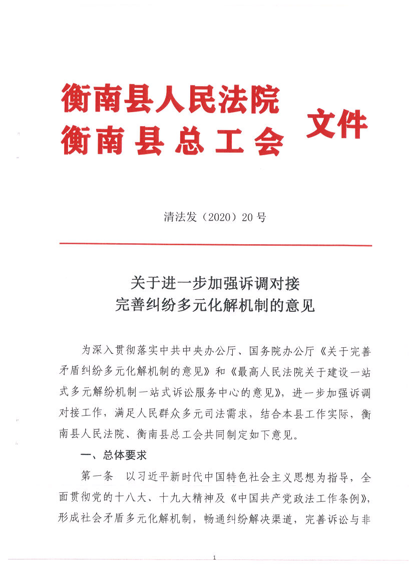 衡南縣人民法院衡南縣總工會關於進一步加強訴調對接完善糾紛多元化解機製的意見(清法發﹝2020﹞20號)