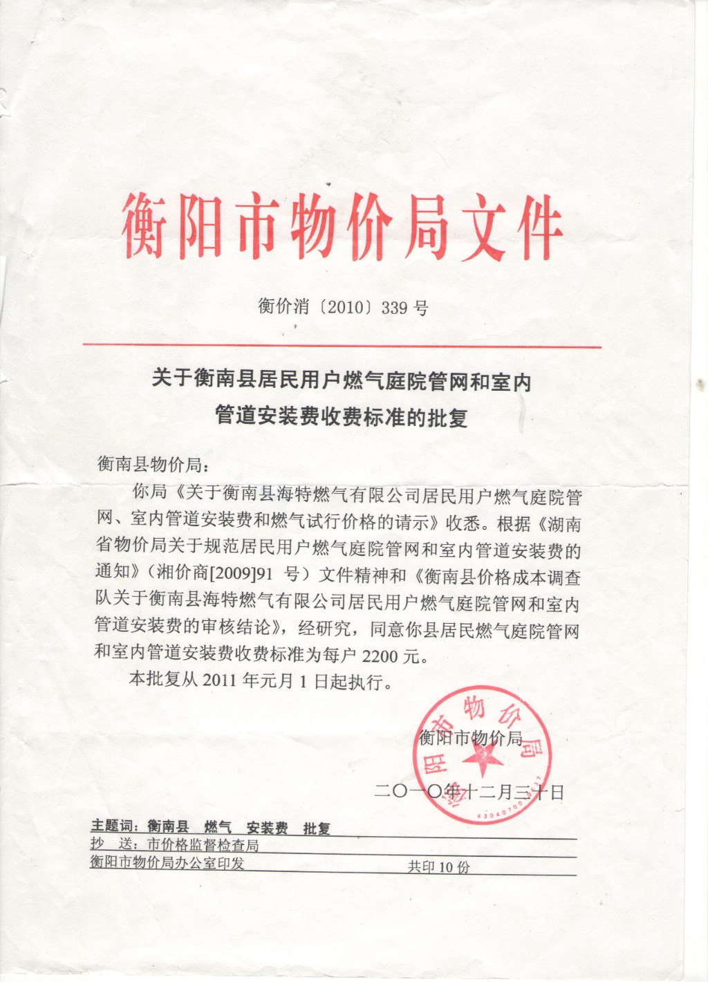 關於衡南縣居民用戶燃氣庭院管網和室內管道安裝費收費標準的批複(衡價消﹝2010﹞339號)