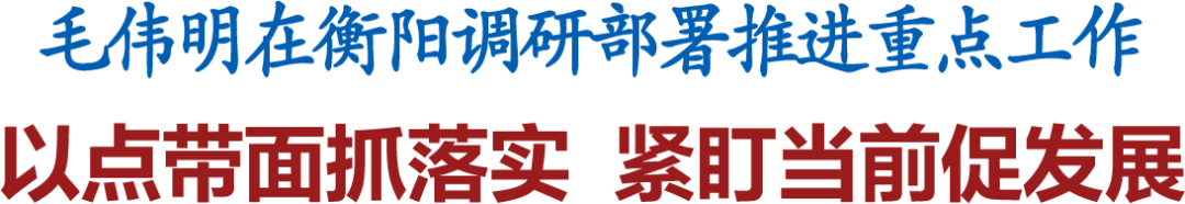 5月20日,省委副書記、省長毛偉明來到衡陽市,考察調研生態保護修複、防汛和安全生產,以及"兩新""兩重"、"五經普"等工作,研究推進當前各項重點工作。他強調,要學深悟透習近平總書記考察湖南重要講話和指示精神,緊盯當前狠抓重點工作落實,一步不落地把各項工作抓到位,確保"時間過半、任務過半"。